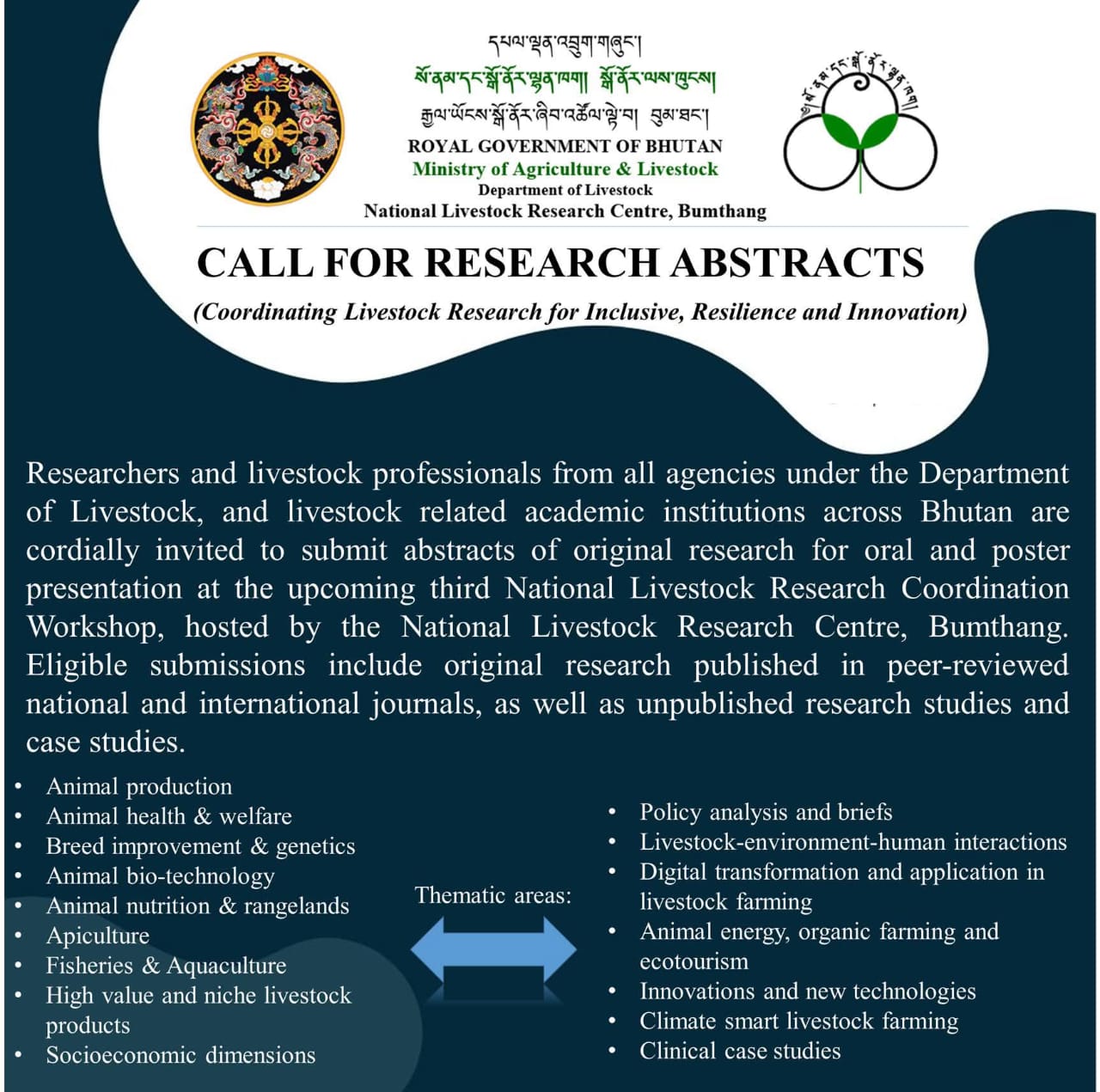 Researchers, and livestock professionals from all agencies under the Department of Livestock, and livestock related academic institutions across Bhutan are cordially invited to submit abstracts of original research for oral and poster presentation at the upcoming 3rd National Livestock Research Coordination Workshop (NLRCW), hosted by the National Livestock Research Centre (NLRC), Bumthang.